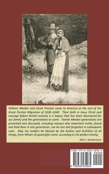 Alan Carl Handermann is a retired chemical engineer who researched his Meeker family tree for two years and discovered his 9th great grandparents (William and Sarah Meeker), two American Revolutionary War patriots (Timothy Meeker Sr. and Timothy Meeker Jr.) along with an American Civil War veteran (Thomas Jefferson Meeker) in his Meeker family lineage. He has three children and fourteen grandchildren and he has written his first book in honor of his mother Mary Catherine nee Meeker Handermann.