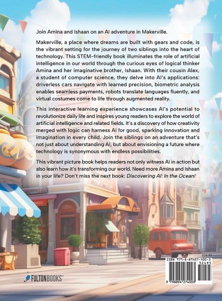 Join Amina and Ishaan on an AI adventure in Makerville. Makerville, a place where dreams are built with gears and code, is the vibrant setting for the journey of two siblings into the heart of technology. This STEM-friendly book illuminates the role of artificial intelligence in our world through the curious eyes of logical thinker Amina and her imaginative brother, Ishaan. With their cousin Alex, a student of computer science, they delve into AI's applications: driverless cars navigate with learned precision, biometric analysis enables seamless payments, robots translate languages fluently, and virtual costumes come to life through augmented reality. This interactive learning experience showcases AI's potential to revolutionize daily life and inspires young readers to explore the world of artificial intelligence and related fields. It's a discovery of how creativity merged with logic can harness AI for good, sparking innovation and imagination in every child. Join the siblings on an adventure that's not just about understanding AI, but about envisioning a future where technology is synonymous with endless possibilities. This vibrant picture book helps readers not only witness AI in action but also learn how it's transforming our world. Need more Amina and Ishaan in your life? Don't miss the next book: Discovering AI: In the Ocean!