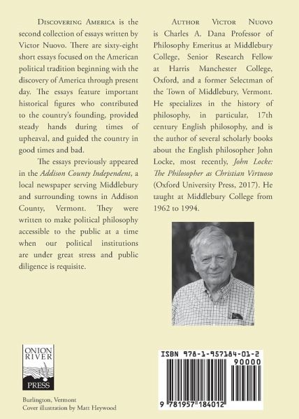 Discovering America is the second collection of essays written by Victor Nuovo. There are sixty-eight short essays focused on the American political tradition beginning with the discovery of America through present day. The essays feature important historical figures who contributed to the country's founding, provided steady hands during times of upheaval, and guided the country in good times and bad. The essays previously appeared in the Addison County Independent, a local newspaper serving Middlebury and surrounding towns in Addison County, Vermont. They were written to make political philosophy accessible to the public at a time when our political institutions are under great stress and public diligence is requisite.