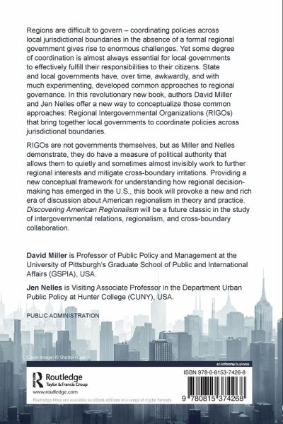 Regions are difficult to govern - coordinating policies across local jurisdictional boundaries in the absence of a formal regional government gives rise to enormous challenges. Yet some degree of coordination is almost always essential for local governments to effectively fulfill their responsibilities to their citizens. State and local governments have, over time, awkwardly, and with much experimenting, developed common approaches to regional governance. In this revolutionary new book, authors David Miller and Jen Nelles offer a new way to conceptualize those common approaches: Regional Intergovernmental Organizations (RIGOs) that bring together local governments to coordinate policies across jurisdictional boundaries. RIGOs are not governments themselves, but as Miller and Nelles demonstrate, they do have a measure of political authority that allows them to quietly and sometimes almost invisibly work to further regional interests and mitigate cross-boundary irritations. Providing a new conceptual framework for understanding how regional decision-making has emerged in the U.S., this book will provoke a new and rich era of discussion about American regionalism in theory and practice. Discovering American Regionalism will be a future classic in the study of intergovernmental relations, regionalism, and cross-boundary collaboration.