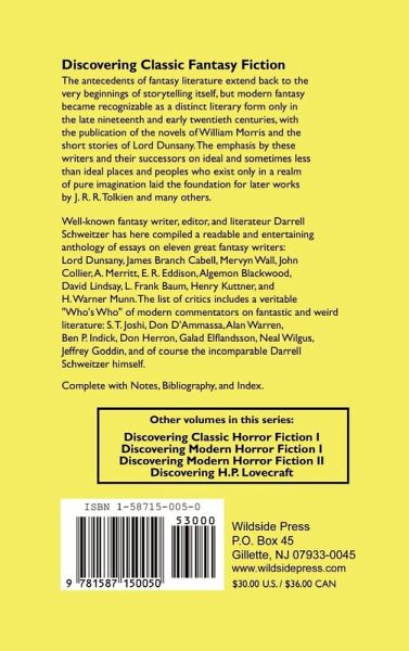 Discovering Classic Fantasy Fiction: Essays on the Antecedents of Fantastic Literature is a compilation of critical essays exploring the roots and development of classic fantasy literature. Published in 1996, this anthology includes contributions from notable scholars and critics who examine the works of various influential authors in the fantasy genre. Included are:Introduction - Darrell Schweitzer Lord Dunsany: The Career of a Fantaisiste - S.T. Joshi James Branch Cabell: No Fit Employment for a Grown Man - Don D'Ammassa Mervyn Wall and the Comedy of Despair - Darrell Schweitzer John Collier, Fantastic Miniaturist - Alan Warren A. Merritt: A Dreamer and a Visionary - Jack L. Chalker Hope Mirrlees: Antiquarian and Innovator - Gary C. Hoppenstand E. R. Eddison: A Literary Biography - Brian Attebery Fritz Leiber and the New, Improved Weird Tale - Bruce Byfield The Secret Life of Arthur Machen - Mark Valentine Clark Ashton Smith: The Last of the Great Romantics - Steve Behrends Bibliographical Checklist of Critical Studies in Classic Fantasy Literature - Compiled by Marshall B. Tymn