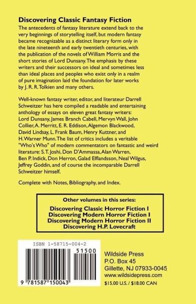 Discovering Classic Fantasy Fiction: Essays on the Antecedents of Fantastic Literature is a compilation of critical essays exploring the roots and development of classic fantasy literature. Published in 1996, this anthology includes contributions from notable scholars and critics who examine the works of various influential authors in the fantasy genre. Included are:Introduction - Darrell Schweitzer Lord Dunsany: The Career of a Fantaisiste - S.T. Joshi James Branch Cabell: No Fit Employment for a Grown Man - Don D'Ammassa Mervyn Wall and the Comedy of Despair - Darrell Schweitzer John Collier, Fantastic Miniaturist - Alan Warren A. Merritt: A Dreamer and a Visionary - Jack L. Chalker Hope Mirrlees: Antiquarian and Innovator - Gary C. Hoppenstand E. R. Eddison: A Literary Biography - Brian Attebery Fritz Leiber and the New, Improved Weird Tale - Bruce Byfield The Secret Life of Arthur Machen - Mark Valentine Clark Ashton Smith: The Last of the Great Romantics - Steve Behrends Bibliographical Checklist of Critical Studies in Classic Fantasy Literature - Compiled by Marshall B. Tymn