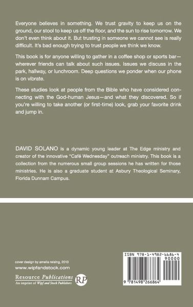 Everyone believes in something. We trust gravity to keep us on the ground, our stool to keep us off the floor, and the sun to rise tomorrow. We don't even think about it. But trusting in someone we cannot see is really difficult. It's bad enough trying to trust people we think we know. This book is for anyone willing to gather in a coffee shop or sports bar--wherever friends can talk about such issues. Issues we discuss in the park, hallway, or lunchroom. Deep questions we ponder when our phone is on vibrate. These studies look at people from the Bible who have considered connecting with the God-human Jesus--and what they discovered. So if you're willing to take another (or first-time) look, grab your favorite drink and jump in.