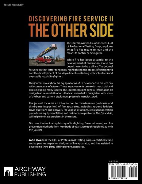 This journal, written by John Owens CEO of Professional Testing Corp., explores what fire has meant to man and the means to control or extinguish. While fire has been essential to the development of civilization, it also has been known to be a villain. The Journal focuses on that latter tendency, highlighting the stages of firefighting and the development of fire departments-starting with volunteers and eventually to paid firefighters. This journal reveals how fire equipment was first developed to present day with current manufacturers. These improvements came with much trial and error, including many failures. This journal contains general information on design features and situations that can overwhelm firefighters with some of the best and current equipment presently manufactured. The journal includes an introduction to maintenance (in-house and third-party inspection) of fire apparatus, including ground ladders. Trivia questions and answers, for various situations, represent operation procedures, equipment failure and maintenance problems. The Q's and A's, will help eliminate problems in the future. Discover the fascinating history of firefighting, fire equipment, and fire prevention methods from hundreds of years ago up through today with this journal.