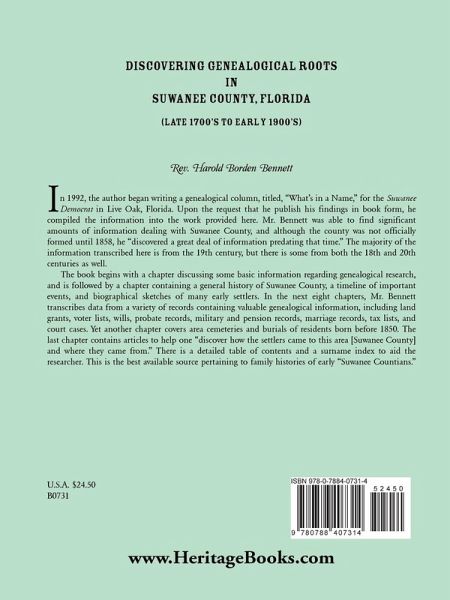In 1992, the author began writing a genealogical column, titled, "What's in a Name," for the Suwanee Democrat in Live Oak, Florida. Upon the request that he publish his findings in book form, he compiled the information into the work provided here. Mr. Bennett was able to find significant amounts of information dealing with Suwanee County, and although the county was not officially formed until 1858, he "discovered a great deal of information predating that time." The majority of the information transcribed here is from the 19th century, but there is some from both the 18th and 20th centuries as well. The book begins with a chapter discussing some basic information regarding genealogical research, and is followed by a chapter containing a general history of Suwanee County, a timeline of important events, and biographical sketches of many early settlers. In the next eight chapters, Mr. Bennett transcribes data from a variety of records containing valuable genealogical information, including land grants, voter lists, wills, probate records, military and pension records, marriage records, tax lists, and court cases. Yet another chapter covers area cemeteries and burials of residents born before 1850. The last chapter contains articles to help one "discover how the settlers came to this area [Suwanee County] and where they came from." There is a detailed table of contents and a surname index to aid the researcher. This is the best available source pertaining to family histories of early "Suwanee Countians."