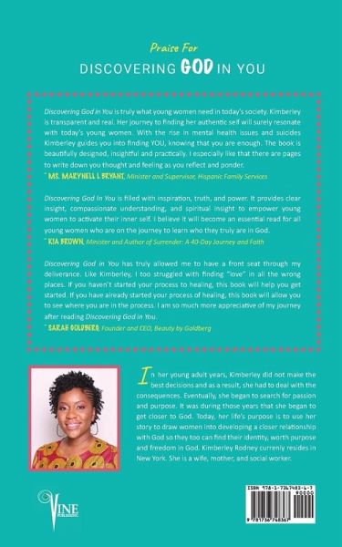 Navigating life as a young adult woman isn't easy. It during that pivotal time of life that most young adults are trying to figure out who they are, how to deal with life's issues and discover their purpose. Author Kimberley Rodney understands the struggle all too well, and as such she provides guidance and inspiration for young adult women in her debut book, Discovering God in You: A Young Woman's Guide to Identity, Worth, Purpose, and Freedom. Discovering God in You helps readers understand the power of forgiveness, who they are in God, their value on the earth, their call to greatness and much more.…mehr