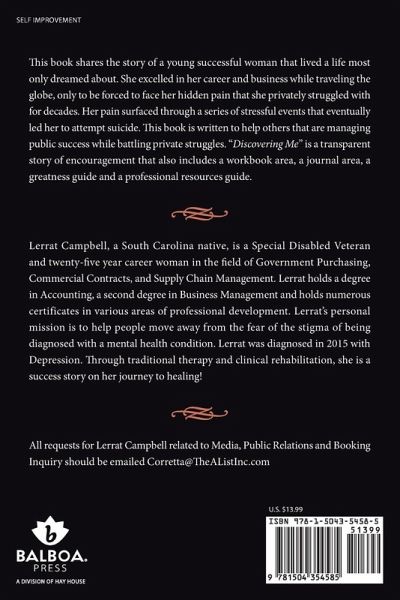 This book shares the story of a young successful woman that lived a life most only dreamed about. She excelled in her career and business while traveling the globe, only to be forced to face her hidden pain that she privately struggled with for decades. Her pain surfaced through a series of stressful events that eventually led her to attempt suicide. This book is written to help others that are managing public success while battling private struggles. "Discovering Me" is a transparent story of encouragement that also includes a workbook area, a journal area, a greatness guide and a professional resources guide.