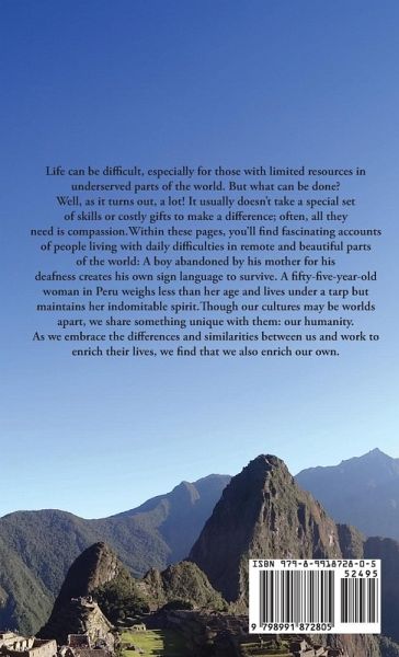 Life can be difficult, especially for those with limited resources in under-served parts of the world. But what can be done? Well, as it turns out, a lot! It usually doesn't take a special set of skills or costly gifts to make a difference; often, all they need is compassion. Within these pages, you'll find fascinating accounts of people living with daily difficulties in remote and beautiful parts of the world: A boy abandoned by his mother for his deafness creates his own sign language to survive. A fifty-five-year-old woman in Peru weighs less than her age and lives under a tarp but maintains her indomitable spirit.Though our cultures may be worlds apart, we share something unique with them: our humanity. As we embrace the differences and similarities between us and work to enrich their lives, we find that we also enrich our own. Read along with us as we, myself and many volunteers, travel throughout the world, forging relationships of trust with people from all walks of life, ultimately sharing in their joys, discoveries, and, yes, tears. As we seek opportunities to share these humanitarian efforts we travel to some exotic locations as well as to some plain and ordinary places. We need to connect with people where they need us.