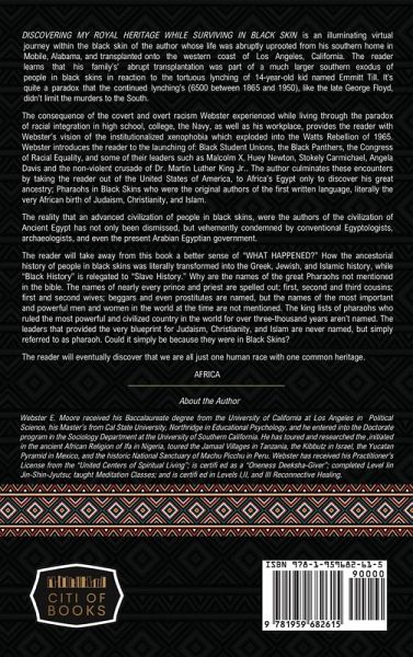 Surviving in Black Skin is an illuminating virtual journey within the black skin of the author whose life was abruptly uprooted from his southern home in Mobile, Alabama, and transplanted onto the western coast of Los Angeles, California. The reader learns that his family's' abrupt transplantation was part of a much larger southern exodus of people in black skins in reaction to the tortuous lynching of 14-year-old kid named Emmitt Till. It's quite a paradox that the continued lynching's (6500 between 1865 and 1950), like the late George Floyd, didn't limit the murders to the South.The consequence of the covert and overt racism Webster experienced while living through the paradox of racial integration in high school, college, the Navy, as well as his workplace, provides the reader with Webster's vision of the institutionalized xenophobia which exploded into the Watts Rebellion of 1965. Webster introduces the reader to the launching of: Black Student Unions, the Black Panthers, the Congress of Racial Equality, and some of their leaders such as Malcolm X, Huey Newton, Stokely Carmichael, Angela Davis and the non-violent crusade of Dr. Martin Luther King Jr.. The author culminates these encounters by taking the reader out of the United States of America, to Africa's Egypt only to discover his great ancestry; Pharaohs in Black Skins who were the original authors of the first written language, literally the very African birth of Judaism, Christianity, and Islam. The reality that an advanced civilization of people in black skins, were the authors of the civilization of Ancient Egypt has not only been dismissed, but vehemently condemned by conventional Egyptologists, archaeologists, and even the present Arabian Egyptian government.The reader will take away from this book a better sense of "WHAT HAPPENED?" How the ancestorial history of people in black skins was literally transformed into the Greek, Jewish, and Islamic history, while "Black History" is relegated to "Slave History." Why are the names of the great Pharaohs not mentioned in the bible. The names of nearly every prince and priest are spelled out; first, second and third cousins; first and second wives; beggars and even prostitutes are named, but the names of the most important and powerful men and women in the world at the time are not mentioned. The king lists of pharaohs who ruled the most powerful and civilized country in the world for over three-thousand years aren't named. The leaders that provided the very blueprint for Judaism, Christianity, and Islam are never named, but simply referred to as pharaoh. Could it simply be because they were in Black Skins? The reader will eventually discover that we are all just one human race with one common heritage.AFRICA