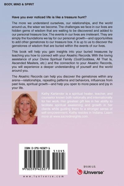 Have you ever noticed that life is like a treasure hunt? The more we understand ourselves, our relationships, and the world around us, the wiser we become. The challenges we face in our lives are hidden gems of wisdom that are waiting to be discovered and added to our personal treasure box. The events in our lives are irrelevant. They are simply the foundations we lay for our personal growth-and opportunities to add other gemstones to our treasure box. It is up to us to discover the gemstones of wisdom that are buried within the events of our lives. This book will help you gain insights into your buried treasures by teaching how to connect with your Akashic Records. With the loving assistance of your Divine Spiritual Family (God/Goddess, All That Is, Ascended Masters, etc.) and the connection to your Akashic Records, you will experience a deeper understanding of yourself and the world around you. The Akashic Records can help you find the gemstones within any arena-relationships, repeating patterns and behaviors, influences from past lives, spiritual growth-and help you open to more peace and joy in your life.
