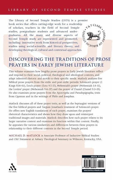 In this volume Michael D. Matlock analyses five lengthy biblical prose prayers from the exilic and post-exilic period: Solomon's prayer (1 Kings 8.14-61), Ezra's prayer (Ezra 9.5-15), Nehemiah's prayer (Nehemiah 1.4-11), the Levites' prayer (Nehemiah 9.4-37), and the prayer of Daniel (Daniel 9:3-19). He also examines prayers from Second Temple literature including texts from the Apocrypha and Pseudepigrapha, the writings of Philo and Josephus and texts from Qumran, and discusses the Septuagintal versions of the five biblical prayers and Targum Jonathan's treatment of Solomon's prayer. He offers a new English translation of each prayer, examines the prayers' rhetorical characteristics, and demonstrates how each prayer draws upon and reinterprets traditional images and materials. Matlock describes how each prayer relates to its larger narrative context and examines its functions within that context. Finally, he appraises the various similarities and differences in these prayers in terms of their different contexts in the Second Commonwealth period noting particular theologies and ideologies.