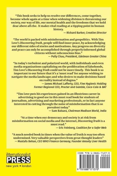 Discovering Truth is an insight-filled exploration of the role of media in communications and how today's social media affects trust in institutions and divides an increasingly polarized society. From the rise of fake news to destabilizing foreign and domestic extremist content, more information does not necessarily lead to more facts. Through the voices of experts and the efforts of an author whose long career is dedicated to marketing communications, Discovering Truth reveals how people have struggled throughout history in seeking and defining truth whenever new forms of communication influenced our values, culture, and the ways in which we receive and impart information. Importantly, author Tim Love offers ways to navigate the discovery of truth in a world where technology platforms instantaneously share and feed misinformation. This book could not be timelier, as it offers a path to a future where we all might better discern between fact and fiction... if we are willing to do the work, ask the right questions, and see more than one perspective. In addition to the experiences of the author, Discovering Truth draws inspiration from business legends like Paul Polman- former CEO of Unilever, John Pepper- former Chairman of Procter & Gamble and The Walt Disney Company, and Keith Reinhard-Chairman Emeritus of DDB Worldwide, as well as contemporary leaders like Facebook's Will Platt-Higgins, VP Global Clients, Stephan Loerke- CEO of WFA/World Federation of Advertisers, Wally Snyder- Executive Director of the Institute for Advertising Ethics, Harvard Business School Professor Jeffrey Rayport and Dr. Augustine Fou, Cybersecurity, Anti-Ad Fraud Consultant and also includes perspective on the subject of truth from renowned ethologist Jane Goodall, founder of the Jane Goodall Institute. Discovering Truth grew out of a lecture Tim Love delivered at Ave Maria University in 2017 to help the school launch a marketing communications curriculum. The lecture became the genesis for a popular podcast series which provides exceptional background for this ongoing examination of the difficulty of determining truth in a world of heightened social media information and data, fake news, unfettered political propaganda, foreign and domestic extremist content, hacks and lies. Love is a former Vice-Chairman of Omnicom Group, the leading worldwide advertising and marketing services company and was raised in a household built on the rapidly growing television and radio sales and service in the 1950's His 42-year career in the advertising industry provided extensive global brand-building experience with some of the world's largest and most reputable advertisers: P&G, Nissan and Infiniti automobiles, PepsiCo, Unilever, Gillette, Mars, UBS, Kraft, Philips and Johnson & Johnson. His global focus for these clients caused him to live in Tokyo, Singapore, Brussels, and New York, obtaining first-hand experience with consumers in over 100 countries. Tim Love has also taught at Oxford University's Said School of Business on "Branding and Communication" and served on the faculty of the US Marketing Communications College, a pro-bono initiative at the Foreign Service Institute of the US State Department. He created the Pulitzer- nominated podcast series titled Tim Love's Discovering Truth. Prior books by the author are "Think Like The Sun", and "The Book That Gets Better With Age."