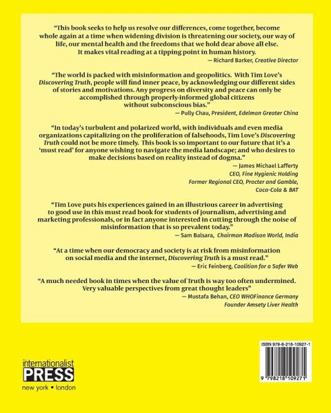 Discovering Truth is an insight-filled exploration of the role of media in communications and how today's social media affects trust in institutions and divides an increasingly polarized society. From the rise of fake news to destabilizing foreign and domestic extremist content, more information does not necessarily lead to more facts. Through the voices of experts and the efforts of an author whose long career is dedicated to marketing communications, Discovering Truth reveals how people have struggled throughout history in seeking and defining truth whenever new forms of communication influenced our values, culture, and the ways in which we receive and impart information. Importantly, author Tim Love offers ways to navigate the discovery of truth in a world where technology platforms instantaneously share and feed misinformation. This book could not be timelier, as it offers a path to a future where we all might better discern between fact and fiction... if we are willing to do the work, ask the right questions, and see more than one perspective. In addition to the experiences of the author, Discovering Truth draws inspiration from business legends like Paul Polman- former CEO of Unilever, John Pepper- former Chairman of Procter & Gamble and The Walt Disney Company, and Keith Reinhard-Chairman Emeritus of DDB Worldwide, as well as contemporary leaders like Facebook's Will Platt-Higgins, VP Global Clients, Stephan Loerke- CEO of WFA/World Federation of Advertisers, Wally Snyder- Executive Director of the Institute for Advertising Ethics, Harvard Business School Professor Jeffrey Rayport and Dr. Augustine Fou, Cybersecurity, Anti-Ad Fraud Consultant and also includes perspective on the subject of truth from renowned ethologist Jane Goodall, founder of the Jane Goodall Institute. Discovering Truth grew out of a lecture Tim Love delivered at Ave Maria University in 2017 to help the school launch a marketing communications curriculum. The lecture became the genesis for a popular podcast series which provides exceptional background for this ongoing examination of the difficulty of determining truth in a world of heightened social media information and data, fake news, unfettered political propaganda, foreign and domestic extremist content, hacks and lies. Love is a former Vice-Chairman of Omnicom Group, the leading worldwide advertising and marketing services company and was raised in a household built on the rapidly growing television and radio sales and service in the 1950's His 42-year career in the advertising industry provided extensive global brand-building experience with some of the world's largest and most reputable advertisers: P&G, Nissan and Infiniti automobiles, PepsiCo, Unilever, Gillette, Mars, UBS, Kraft, Philips and Johnson & Johnson. His global focus for these clients caused him to live in Tokyo, Singapore, Brussels, and New York, obtaining first-hand experience with consumers in over 100 countries. Tim Love has also taught at Oxford University's Said School of Business on "Branding and Communication" and served on the faculty of the US Marketing Communications College, a pro-bono initiative at the Foreign Service Institute of the US State Department. He created the Pulitzer- nominated podcast series titled Tim Love's Discovering Truth. Prior books by the author are "Think Like The Sun", and "The Book That Gets Better With Age."