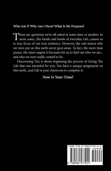 Who Am I? Why Am I Here? What's My Purpose? These are questions we've all asked at some time or another. In most cases... The hustle and bustle of everyday Life...causes us to lose focus of our true existence. However, the real reason why we were put on this earth never goes away. In fact, the more time passes, the more urgent it becomes for us to find out who we are...and who we were really created to be. Discovering You is about beginning the process of Living The Life that was intended for you. You have a unique assignment on this earth...and Life is your classroom to complete it. Now Is Your Time!