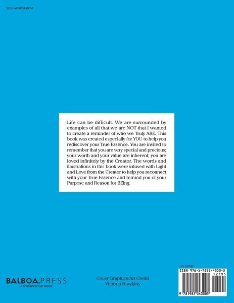 Life can be difficult. We are surrounded by examples of all that we are NOT that I wanted to create a reminder of who we Truly ARE. This book was created especially for YOU to help you rediscover your True Essence. You are invited to remember that you are very special and precious; your worth and your value are inherent; you are loved infinitely by the Creator. The words and illustrations in this book were infused with Light and Love from the Creator to help you reconnect with your True Essence and remind you of your Purpose and Reason for BEing.