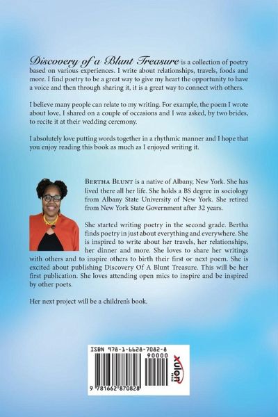 Discovery of a Blunt Treasure is a collection of poetry based on various experiences. I write about relationships, travels, foods and more. I find poetry to be a great way to give my heart the opportunity to have a voice and then through sharing it, it is a great way to connect with others. I believe many people can relate to my writing. For example, the poem I wrote about love, I shared on a couple of occasions and I was asked, by two brides, to recite it at their wedding ceremony. I absolutely love putting words together in a rhythmic manner and I hope that you enjoy reading this book as much as I enjoyed writing it. Bertha Blunt is a native of Albany, New York. She has lived there all her life. She holds a BS degree in sociology from Albany State University of New York. She retired from New York State Government after 32 years. She started writing poetry in the second grade. Bertha finds poetry in just about everything and everywhere. She is inspired to write about her travels, her relationships, her dinner and more. She loves to share her writings with others and to inspire others to birth their first or next poem. She is excited about publishing Discovery Of A Blunt Treasure. This will be her first publication. She loves attending open mics to inspire and be inspired by other poets. Her next project will be a children's book.