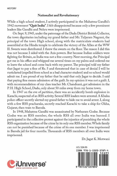 Nationalist and Revolutionary While a high school student, I actively participated in the Mahatma Gandhis 1942 movement Quit India. I felt disappointed because only a few prominent leaders like Gandhi and Nehru were imprisoned. On Sept. 9, 1945, under the patronage of the Dadu District British Collector, the town dignitaries including my grand father and Mr. Tuljaram Nagrani, the principal of the town High school, along with the matriculate students had assembled at the Hindu temple to celebrate the victory of the Allies at the WW II. Sweets were distributed. I threw the sweets on the floor. The reason I did this was not because I sided with the Axis powers. But because Indian soldiers were fighting for Britain, as India was not a free country. Next morning, the Principal got me in his office and whipped me several times on my palms and ordered me to leave the school and come back with my parent. The principal told my father that Jagat to pay a fine of Rs. 5 and threatened that in case of denial I will be rusticketed (expelled from school as a bad character student) and no school would admit me. I am proud of my father that he said that only Jagat to decide. I said that paying fine means admission of the guilt. In my opinion it was not a guilt. I, with recommendation of my class teacher Mr. Chandnani, got admission in the P. H. High School, Dadu, only about 50 miles away from my home town. In 1947 on the eve of partition, there was an accidently bomb explosion in Karachi, suspected of an RSS activity. Several RSS leaders were arrested. A Khalsa police officer secretly alerted my grand father to hide me to avoid arrest. I, along with a few RSS pracharaks, secretly reached Karachi to take a ship for Okha, Gujarat, then train to Baroda. In 1948, Mahatma Gandhi was assassinated by Nathuram Godse. Because Godse was an RSS member, the whole RSS all over India was banned. I participated in the collective protest against the injustice of punishing the whole RSS organization because of the crime by its only one RSS member. Whole family can not be punished because of the crime of its one member. I was imprisoned in Baroda jail for four months. Thousands of RSS members all over India were imprisoned. Dr. Jagat K. Motwani