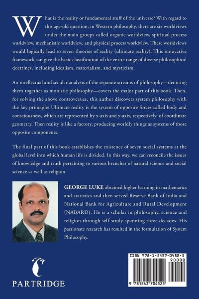 What is the reality or fundamental stuff of the universe? With regard to this age-old question, in Western philosophy, there are six worldviews under the main groups called organic worldview, spiritual process worldview, mechanistic worldview, and physical process worldview. These worldviews would logically lead to seven theories of reality (ultimate reality). This innovative framework can give the basic classification of the entire range of diverse philosophical doctrines, including idealism, materialism, and mysticism. An intellectual and secular analysis of the separate streams of philosophy-denoting them together as monistic philosophy-covers the major part of this book. Then, for solving the above controversies, this author discovers system philosophy with the key principle: Ultimate reality is the system of opposite forces called body and consciousness, which are represented by x-axis and y-axis, respectively, of coordinate geometry. Then reality is like a factory, producing worldly things as systems of those opposite components. The final part of this book establishes the existence of seven social systems at the global level into which human life is divided. In this way, we can reconcile the issues of knowledge and truth pertaining to various branches of natural science and social science as well as religion.