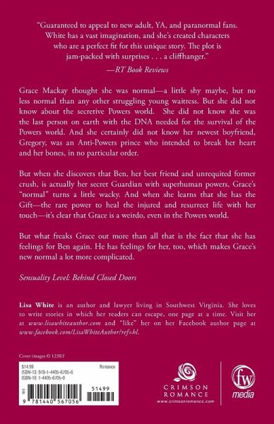 Grace Mackay thought she was normal, a little shy maybe, but no less normal than any other struggling young waitress. But she did not know about the secretive Powers world. She did not know she was the last person on earth with the DNA needed for the Powers' survival. And she certainly did not know her newest boyfriend, Gregory, was an Anti-Powers prince who intended to break her heart and her bones in no particular order. But when she discovers that Ben, her best friend and unrequited former crush, is actually her secret Guardian with superhuman powers, Grace's normal turns a little wacky. And when she learns that she has The Gift, the rare power to heal the injured and resurrect life with her touch, it is official - Grace is a weirdo even in the Powers world. But what freaks Grace out more than all that is the fact she has feelings for Ben again - and he has feelings for her - which makes Grace's new normal a lot more complicated. Sensuality Level: Behind Closed Doors
