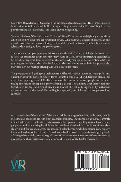 My 138,000 word novel, Discovery, is the first book of my book series 'The Humanimals.' It is an action packed fun-filled thrilling story that begins when twins 'discover' they have the power to morph into animals...yet that is only the beginning. Set near Madison, Wisconsin, twins Emily and Tony Dunn are normal eighth grade students when Emily first discovers her newfound power. What follows is a series of adventures and misadventures by the twins exploring Emily's abilities and limitations, both at home and at school, while trying to keep her powers secret. Tony soon comes upon powers of his own while the twins' mom, a biologist, is determined to find the reason her twins have their newfound abilities. Some investigating leads her to believe they may stem from an accident that occurred years ago at her workplace while she was pregnant with her twins. She also finds out there may be others with similar powers who may have devious revenge driven plans as to how to use them. The progression of figuring out their powers is filled with action, suspense, teenage fun and a number of thrills. Soon, the story drives towards a complicated and dramatic climax that may blow up a large part of Madison and cost the lives of numerous people and animals. Facing the risk of having their powers found out, can Tony, Emily, their family and best friends save the day? And even if they try, is it worth the risk of being found by authorities to have supernatural powers? The ending is suspenseful and filled with a couple touching surprises.