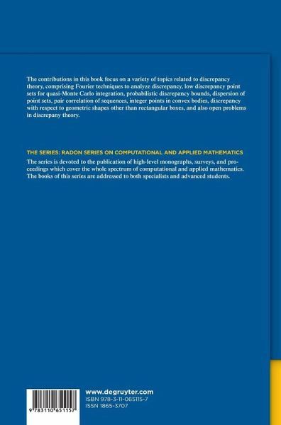 The contributions in this book focus on a variety of topics related to discrepancy theory, comprising Fourier techniques to analyze discrepancy, low discrepancy point sets for quasi-Monte Carlo integration, probabilistic discrepancy bounds, dispersion of point sets, pair correlation of sequences, integer points in convex bodies, discrepancy with respect to geometric shapes other than rectangular boxes, and also open problems in discrepany theory.