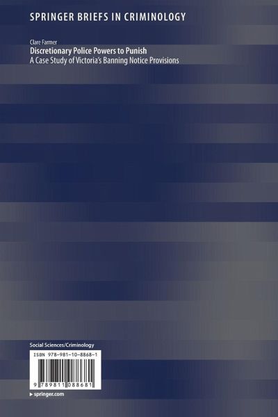 This book uses an Australian case study to shine a much-needed spotlight on discretionary police powers to punish, and their implications for justice and human rights. It offers a revealing analysis of the problematic rationales that secured the legislative passage of banning notice provisions through the State Parliament of Victoria, Australia in 2007, which occurred amidst similar developments in other jurisdictions across the world: in the UK, New Labour's "tough on crime" initiative in the 1990s, responses to the post 9/11 terror threat, and more recent lockout laws in Sydney, Australia. The Victorian case study offers a range of datasets including Hansard parliamentary debates, Victoria Police data, media coverage and interviews with magistrates. This material provides critical insights into the broader consequences of discretionary police powers, including their effect upon the separation of powers, individual rights, and the steady and largely unchecked proliferation of discretionary police powers across most Australian jurisdictions. On the tenth anniversary of these first Victorian on-the-spot banning powers, this Brief provides a sound basis for subsequent criminological explorations of the effectiveness of banning in tackling issues of disorder, deterrence and punishment, and of the broader challenge of balancing individual rights and community protection.