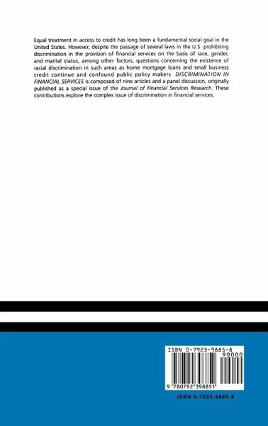 Equal treatment in access to credit has long been a fundamental social goal in the United States. However, despite the passage of several laws in the U.S. prohibiting discrimination in the provision of financial services on the basis of race, gender, and marital status, among other factors, questions concerning the existence of racial discrimination in such areas as home mortgage loans and small business credit continue, and confound public policy makers. This book is composed of nine articles and a panel discussion, originally published as a special issue of the Journal of Financial Services Research. These contributions explore the complex issue of discrimination in financial services.