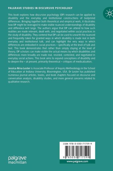 This book explores how discursive psychology (DP) research can be applied to disability and the everyday and institutional constructions of bodymind differences. Bringing together both theoretical and empirical work, it illustrates how DP might be leveraged to make visible nuanced understandings of disability and difference writ large. The authors argue that DP can attend to how such realities are made relevant, dealt with, and negotiated within social practices in the study of disability. They contend that DP can be used to unearth the nuanced and frequently taken for granted ways in which disability is made real in both everyday and institutional talk, and can highlight the very ways in which differences are embodied in social practices - specifically at the level of talk and text. This book demonstrates that rather than simply staying at the level of theory, DP scholars can make visible the actual means by which disabilities and differences more broadly aremade real, resisted, contested, and negotiated in everyday social actions. This book aims to expand conceptions of disability and to deepen the - at present, primarily theoretical - critiques of medicalization.