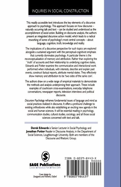 `In this study, Edwards and Potter make a systematic attempt to make clear the nature, scope and methods of discursive psychology, the (final?) descendant of the revolution against na[um]ive empiricism and positivist metaphysics of the behaviourist tradition... It is evident from the publication of this and other first-class offerings from the Loughborough "stable" that our hopes for a truly scientific psychology now have some chance of being fulfilled' - Rom Harr[ac]e, British Journal of Psychology