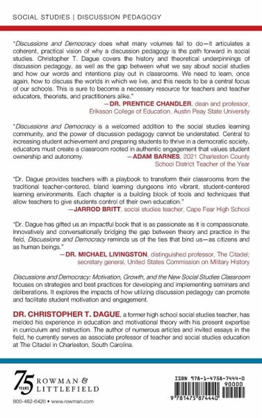 Discussions and Democracy: Motivation, Growth, and the New Social Studies Classroom is written in a vernacular that will springboard and support teachers’ understandings of implementing discussion-based approaches in their classrooms. Moreover, Discussions and Democracy drills down more deeply into student motivation and engagement. This is braided through a detailed and easy-to-understand explanation of both self-determination and self-efficacy. Understanding the principles of motivation in the teaching and learning process is essential to effective pedagogy. Discussions and Democracy is written by an author with nearly two decades of experience in the classroom – both as a teacher and as a teacher educator. This book can serve the needs of both new and experienced teachers interested in applying new methods of instruction to their already existing practice. The aim throughout is to bring important concepts and theories out of the "ivory tower" and onto the hard ground of real-world experience as a guide for today’s social studies teachers.