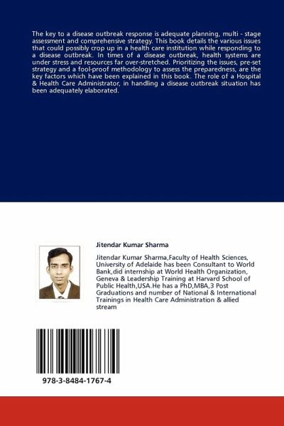 The key to a disease outbreak response is adequate planning, multi - stage assessment and comprehensive strategy. This book details the various issues that could possibly crop up in a health care institution while responding to a disease outbreak. In times of a disease outbreak, health systems are under stress and resources far over-stretched. Prioritizing the issues, pre-set strategy and a fool-proof methodology to assess the preparedness, are the key factors which have been explained in this book. The role of a Hospital & Health Care Administrator, in handling a disease outbreak situation has been adequately elaborated.