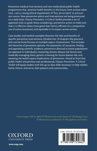 Preventive medical interventions and non-medicalised public health programmes that promise health benefits in the future, from actions taken now, carry a strong ethical requirement of 'first, do no harm' or primum non nocere. New preventive advice and interventions are being promoted on a daily basis, Disease Prevention: A Critical Toolkit provides a set of appraisal tools to guide those considering a preventive action to make sure that it is effective (does more good than harm), efficient (is a competitive use of scarce resources), and equitable in its impact across society. Case studies and worked examples illustrate the risks and benefits of specific preventive interventions. Divided into 10 chapters this practical and concise book focuses on multiple aspects of prevention including the hierarchy of preventive options; the assessment of causation; finding and appraising scientific evidence; prevention directed at entire populations (as opposed to individuals); measuring chronic disease risk factors and medically managing them: statin treatment of high cholesterol; PSA screening for prostate cancer; genetic screening for future disease risk; and assessing the health equity implications of prevention. Aimed at front-line public health and primary care professionals, Disease Prevention: A Critical Toolkit will equip them with the up-to-date skills necessary to help them better inform and serve their patients and communities.