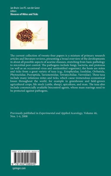 Diseases of mites and ticks: farewell to Leo van der Geest.- Diseases of mites and ticks: from basic pathology to microbial control-an introduction.- Using RNA interference to determine the role of varisin in the innate immune system of the hard tick Dermacentor variabilis (Acari: Ixodidae).- Silencing expression of the defensin, varisin, in male Dermacentor variabilis by RNA interference results in reduced Anaplasma marginale infections.- Potential effects of mixed infections in ticks on transmission dynamics of pathogens: comparative analysis of published records.- An association between the Antarctic mite Alaskozetes antarcticus and an entomophthoralean fungus of the genus Neozygites.- Diversity of acaropathogenic fungi in Poland and other European countries.- Entomopathogenic fungi against South American tick species.- Pathogenicity and thermotolerance of entomopathogenic fungi for the control of the scab mite, Psoroptes ovis.- Impact of two treatments of a formulation of Beauveria bassiana (Deuteromycota: Hyphomycetes) conidia on Varroa mites (Acari: Varroidae) and on honeybee (Hymenoptera: Apidae) colony health.- Topically applied myco-acaricides for the control of cattle ticks: overcoming the challenges.- Protection of Metarhizium anisopliae conidia from ultra-violet radiation and their pathogenicity to Rhipicephalus evertsi evertsi ticks.- Evaluation of Metarhizium anisopliae (Deuteromycota: Hyphomycetes) for control of broad mite Polyphagotarsonemus latus (Acari: Tarsonemidae) in mulberry.- Enabling mycelial application of Hirsutella thompsonii for managing the coconut mite.- A tale of three acaropathogenic fungi in Israel: Hirsutella, Meira and Acaromyces.- Lessons from interactions within the cassava green mite fungal pathogen Neozygites tanajoaesystem and prospects for microbial control using Entomophthorales.- Failure of the mite-pathogenic fungus Neozygites tanajoae and the predatory mite Neoseiulus idaeus to control a population of the cassava green mite, Mononychellus tanajoa.- The effects of Pseudomonas putida biotype B on Tetranychus urticae (Acari: Tetranychidae).- Overwintering and prevalence of Neozygites floridana (Zygomycetes: Neozygitaceae) in hibernating females of Tetranychus urticae (Acari: Tetranychidae) under cold climatic conditions in strawberries.- Sprays of emulsifiable Beauveria bassiana formulation are ovicidal towards Tetranychus urticae (Acari: Tetranychidae) at various regimes of temperature and humidity.- Role of entomopathogenic fungi in the control of Tetranychus evansi and Tetranychus urticae (Acari: Tetranychidae), pests of horticultural crops.- Effect of temperature on virulence of Beauveria bassiana and Metarhizium anisopliae isolates to Tetranychus evansi.- Side-effects of pesticides on the life cycle of the mite pathogenic fungus Neozygites floridana.- Natural enemies of mass-reared predatory mites (family Phytoseiidae) used for biological pest control.- Verified and potential pathogens of predatory mites (Acari: Phytoseiidae).- Symbionts, including pathogens, of the predatory mite Metaseiulus occidentalis: current and future analysis methods.