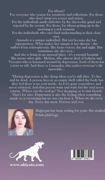 For whom? For everyone who yearns for sensitivity and reflections. For those who don't await sex scenes and action. For the individuals made defective by the day-to-day grind and rejected by the society. For those, for whom getting up in the morning is a sick torment. For the individuals who can't find understanding in their close ones. Amanda is a unique individual. But not because she has superpowers. What makes her unique is her disease - she suffers from schizophrenia. She hears voices; day and night. But sometimes she also sees... And she is living in an unusual place - it's a mental hospital. She meets other girls - Melissa, who almost died of bulimia and Veronica who is hemmed around by depression. Each of them has a story to tell. And there is Cassandra, who makes everyone's life miserable... ""Having depression is like dying when you're still alive. To live and be dead. A person lives in an empty shell called the body but they feel there is no soul inside. As if it's gone somewhere and never returned. And that person waits and waits but the soul never returns. Where can the soul go? Not shopping or to visit friends. That's for sure. Depression is also the feeling when something inside us is screaming but no one can hear it. When we die every day. Every day anew. Forever and ever.