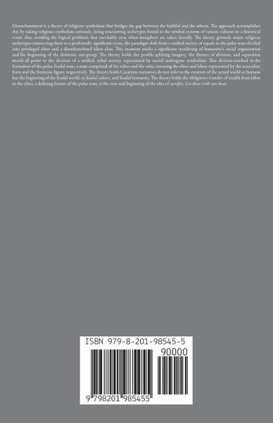 Disenchantment is a theory of religious symbolism that bridges the gap between the faithful and the atheist. The approach accomplishes this by taking religious symbolism seriously, tieing reoccurring archetypes found in the symbol systems of various cultures to a historical event, thus avoiding the logical problems that inevitably arise when metaphors are taken literally. The theory grounds major religious archetypes connecting them to a profoundly significant event, the paradigm shift from a unified society of equals to the polar state divided into privileged elites and a disenfranchised labor class. This moment marks a significant reordering of humanity's social organization and the beginning of the domestic out-group. The theory holds the prolific splitting imagery, the themes of division, and separation motifs all point to the division of a unified, tribal society, represented by sacred androgyne symbolism. This division resulted in the formation of the polar, feudal state, a state comprised of the rulers and the rules, meaning the elites and labor, represented by the masculine form and the feminine figure, respectively. The theory holds Creations narratives do not refer to the creation of the actual world or humans but the beginning of the feudal world, or feudal culture, and feudal humanity. The theory holds the obligatory transfer of wealth from labor to the elites, a defining feature of the polar state, is the root and beginning of the idea of sacrifice. Let those with ears hear.