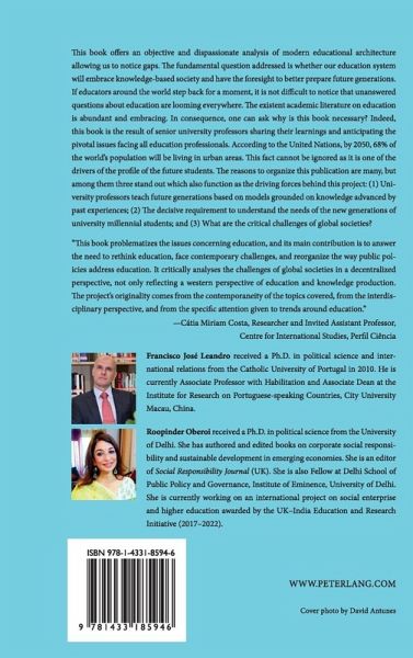 This book offers an objective and dispassionate analysis of modern educational architecture allowing us to notice gaps. The fundamental question addressed is whether our education system will embrace knowledge-based society and have the foresight to better prepare future generations. If educators around the world step back for a moment, it is not difficult to notice that unanswered questions about education are looming everywhere. The existent academic literature on education is abundant and embracing. In consequence, one can ask why is this book necessary? Indeed, this book is the result of senior university professors sharing their learnings and anticipating the pivotal issues facing all education professionals. According to the United Nations, by 2050, 68% of the world's population will be living in urban areas. This fact cannot be ignored as it is one of the drivers of the profile of the future students. The reasons to organize this publication are many, but among them three stand out which also function as the driving forces behind this project: (1) University professors teach future generations based on models grounded on knowledge advanced by past experiences; (2) The decisive requirement to understand the needs of the new generations of university millennial students; and (3) What are the critical challenges of global societies?