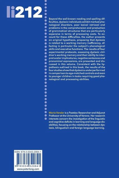 Beyond the well-known reading and spelling difficulties, dyslexic individuals exhibit marked phonological disorders, poor lexical retrieval and problems in the comprehension and production of grammatical structures that are particularly expensive in terms of processing costs. To account for these difficulties, the author presents an original hypothesis, proposing that dyslexia is related to a working memory inefficiency, affecting in particular the subject's phonological skills and executive functions. The results of four experimental protocols, assessing dyslexic children's working memory and their ability to interpret scalar implicatures, negative sentences and pronominal expressions, are presented and discussed in this volume. Consistent with the hypothesis outlined in this book, the results of the four studies show that dyslexics underperformed in comparison to age-matched controls and even to younger children in tasks requiring good phonological and processing abilities.