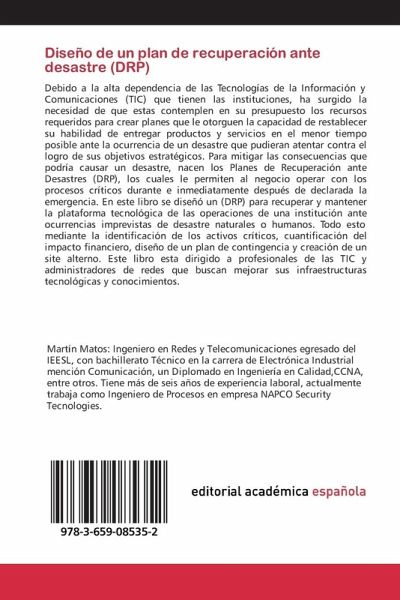 Debido a la alta dependencia de las Tecnologías de la Información y Comunicaciones (TIC) que tienen las instituciones, ha surgido la necesidad de que estas contemplen en su presupuesto los recursos requeridos para crear planes que le otorguen la capacidad de restablecer su habilidad de entregar productos y servicios en el menor tiempo posible ante la ocurrencia de un desastre que pudieran atentar contra el logro de sus objetivos estratégicos. Para mitigar las consecuencias que podría causar un desastre, nacen los Planes de Recuperación ante Desastres (DRP), los cuales le permiten al negocio operar con los procesos críticos durante e inmediatamente después de declarada la emergencia. En este libro se diseñó un (DRP) para recuperar y mantener la plataforma tecnológica de las operaciones de una institución ante ocurrencias imprevistas de desastre naturales o humanos. Todo esto mediante la identificación de los activos críticos, cuantificación del impacto financiero, diseño de un plan de contingencia y creación de un site alterno. Este libro esta dirigido a profesionales de las TIC y administradores de redes que buscan mejorar sus infraestructuras tecnológicas y conocimientos.