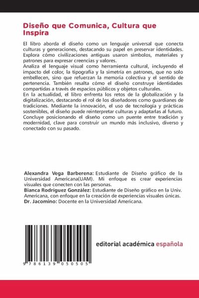 El libro aborda el diseño como un lenguaje universal que conecta culturas y generaciones, destacando su papel en preservar identidades. Explora cómo civilizaciones antiguas usaron símbolos, materiales y patrones para expresar creencias y valores.Analiza el lenguaje visual como herramienta cultural, incluyendo el impacto del color, la tipografía y la simetría en patrones, que no solo embellecen, sino que refuerzan la memoria colectiva y el sentido de pertenencia. También resalta cómo el diseño construye identidades compartidas a través de espacios públicos y objetos culturales.En la actualidad, el libro enfrenta los retos de la globalización y la digitalización, destacando el rol de los diseñadores como guardianes de tradiciones. Mediante la innovación, el uso de tecnología y prácticas sostenibles, el diseño puede reinterpretar culturas y adaptarlas al futuro.Concluye posicionando el diseño como un puente entre tradición y modernidad, clave para construir un mundo más inclusivo, diverso y conectado con su pasado.