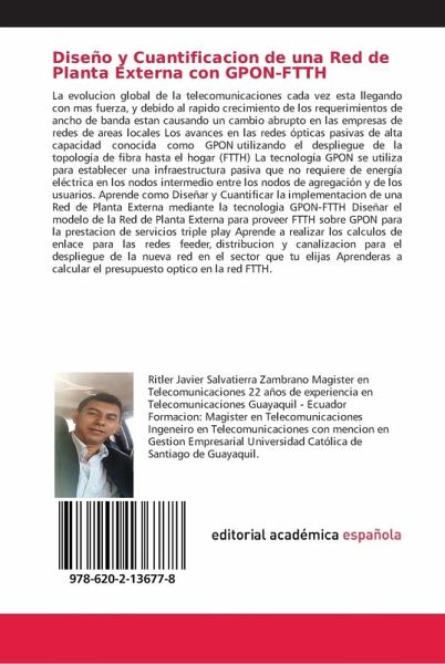 La evolucion global de la telecomunicaciones cada vez esta llegando con mas fuerza, y debido al rapido crecimiento de los requerimientos de ancho de banda estan causando un cambio abrupto en las empresas de redes de areas locales Los avances en las redes ópticas pasivas de alta capacidad conocida como GPON utilizando el despliegue de la topología de fibra hasta el hogar (FTTH) La tecnología GPON se utiliza para establecer una infraestructura pasiva que no requiere de energía eléctrica en los nodos intermedio entre los nodos de agregación y de los usuarios. Aprende como Diseñar y Cuantificar la implementacion de una Red de Planta Externa mediante la tecnologia GPON-FTTH Diseñar el modelo de la Red de Planta Externa para proveer FTTH sobre GPON para la prestacion de servicios triple play Aprende a realizar los calculos de enlace para las redes feeder, distribucion y canalizacion para el despliegue de la nueva red en el sector que tu elijas Aprenderas a calcular el presupuesto optico en la red FTTH.