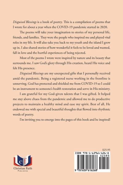 Disguised Blessings is a book of poetry. This is a compilation of poems that I wrote for about a year when the COVID-9 pandemic started in 2020. The poems will take your imagination to stories of my personal life, friends, and families. They were the people who inspired me and played vital roles in my life. It will also take you back to my youth and the island I grew up in. In my poems I also shared stories of how wonderful it is to love, be loved, and the hurtful experience of being rejected. A lot of the poetry I wrote were inspired by nature and its beauty that surrounds me. I saw God's glory through His creation and heard His voice and felt His presence. Disguised Blessings are my unexpected gifts that I personally received amid the pandemic. Being a registered nurse working in the frontline is unnerving. God had protected and shielded me from COVID-19 so I could continue serving in His ministry of healing. God had blessed me with talents that I was able to use when I most needed them to keep myself above all chaos from the pandemic. I was able to do many to maintain a healthy mind and spirit. Best of all, he endowed me with special and beautiful thoughts that flowed into rhythmic words of poetry. I'm inviting you to emerge into the pages of this book and be inspired!