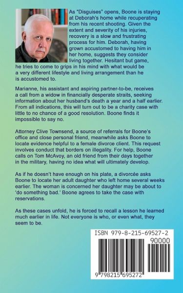 As "Disguises" opens, Boone is staying at Deborah's home while recuperating from his recent shooting. Given the extent and severity of his injuries, recovery is a slow and frustrating process for him. Deborah, having grown accustomed to having him in her home, suggests they consider living together. Hesitant but game, he tries to come to grips in his mind with what would be a very different lifestyle and living arrangement than he is accustomed to. Marianne, his assistant and aspiring partner-to-be, receives a call from a widow in financially desperate straits, seeking information about her husband's death a year and a half earlier. From all indications, this will turn out to be a charity case with little to no chance of a good resolution. Boone finds it impossible to say no. Attorney Clive Townsend, a source of referrals for Boone's office and close personal friend, meanwhile asks Boone to locate evidence helpful to a female divorce client. This request involves conduct that borders on illegality. For help, Boone calls on Tom McAvoy, an old friend from their days together in the military, having no idea of what will ultimately develop. As if he doesn't have enough to demand his attention, a divorcée asks Boone to locate her adult daughter who left home several weeks earlier. The woman is concerned her daughter may about to 'do something bad.' Boone agrees to take the case with reservations. As these cases unfold, he is forced to recall a lesson he learned much earlier in life. Everyone is not who, or even what, they seem to be.