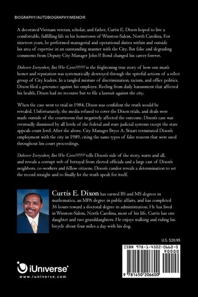 A decorated Vietnam veteran, scholar, and father, Curtis E. Dixon hoped to live a comfortable, fulfilling life in his hometown of Winston-Salem, North Carolina. For nineteen years, he performed managerial and operational duties within and outside his area of expertise in an outstanding manner with the City. But false and degrading comments from Deputy City Manager John P. Bond changed his career forever. Dishonor Everywhere, But Who Cares?????? is the frightening true story of how one man's honor and reputation was systematically destroyed through the spiteful actions of a select group of individuals. In a tangled mixture of discrimination, racism, and office politics, Dixon filed a grievance against his employer. Reeling from daily harassment that affected his health, Dixon had no recourse but to file a lawsuit against the city. When the case went to trial in 1984, Dixon was confident the truth would be revealed. Unfortunately, the media refused to cover the Dixon trials, and deals were made outside of the courtroom that negatively affected the outcome. Dixon's case was eventually dismissed by all levels of the federal and state judicial systems except the state appeals court level. After the above, City Manager Stuart terminated Dixon's employment with the city in 1989, citing the same types of false reasons that were used throughout his court proceedings. Dishonor Everywhere, But Who Cares?????? tells Dixon's side of the story, warts and all, and Reveals a corrupt web of betrayal from elected officials and a large cast of Dixon's neighbors, co-workers and fellow citizens. Dixon's candor reveals a determination to set the record straight and to finally let the truth speak for itself.
