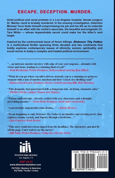A 15-year-old Iranian girl is viciously attacked by her father for holding a boy's hand. In running to escape certain death, she undertakes a dangerous journey to a new land with unfamiliar customs, where she must hide the truth from everyone she meets. Twenty years later, amid racial tensions in a Los Angeles hospital, a female Muslim doctor is murdered, sparking a controversial police investigation. The lead investigator, Detective Michael Tucci, finds himself compromising both his job and his life as he embroils himself in an affair with the beautiful Dr. Tara White, the victim's associate, who could be the killer's next target. Which suspect would have had a reason to kill her colleague, Marika, and possibly even Tara herself: the distinguished neurosurgeon who was Marika's mentor, jealous of her youth and ambition; the rebuffed shy resident who once dated her; Marika's secret lover or his bitter wife; Marika's fundamentalist cousin, angry with her modern ways; any of the volatile protestors, picketing too many foreigners taking their jobs; or someone Marika knew, returning from her hidden past? Inspired by the real-life issue of honor killings, Dishonor Thy Father is a multicultural thriller spanning three decades and two continents that boldly explores issues of ethnicity, sexism, spirituality, and social mores in today's complex and heated political environment.