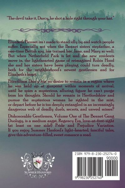 VOLUME ONE of The Bennet Gang Duology: Dishonorable Gentlemen Elizabeth Bennet isn't made to stand idly by and watch people suffer. Especially not when the Bennet sisters' stepfather, a one-time British spy, has trained her, Jane, and Mary so well. But when Netherfield Park is let and the new residents move in, the lighthearted game of reimagined Robin Hood she and her sisters have been playing could turn deadly, both for the neighborhood's newest gentlemen and for Elizabeth's heart. Fitzwilliam Darcy has no desire to remain in a region where he was held up at gunpoint within moments of arrival, until he spies a mysterious, alluring figure he can't purge from his thoughts. Should he remain in Hertfordshire and pursue the mysterious woman he sighted in the mist, or depart before he is too deeply entangled in an increasingly dangerous web of deadly duels, secrets, and unwed misses? Dishonorable Gentlemen, Volume One of The Bennet Gang Duology, is a medium angst, Regency Era, love-at-first-sight (at least on one side!) Pride and Prejudice Variation. If you enjoy Summer Hanford's light-hearted, fanciful tales, give this adventure-filled, sweet romance a read.