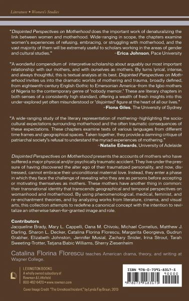 Disjointed Perspectives on Motherhood seeks to reevaluate the concept of unconditional maternal love and the global emancipation of motherhood as recorded from 17th century onward and as analyzed in various genres: cinema, poetry, novel, drama, and mystery fiction series. By using unprecedented comparative critical approaches such as phenomenological, medical, feminist, and re-enchantment theories, and by analyzing works from literature, cinema, and visual arts, this collection attempts to reestablish and redefine a canonical concept with the intention to revitalize an otherwise taken-for-granted image and role.