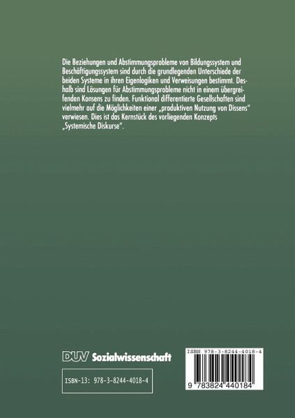 0 Einleitende Forschungsskizze.- 1 Die Wahrnehmung der Beziehungen von Bildungssystem und Beschäftigungssystem als Bedarf gesteigerter Abstimmung und Steuerung: Problembeobachtungen und Grenzen traditioneller Ansätze.- 2 Abstimmung und Steuerung: ein theoretischer Bezugsrahmen.- 2.1 Leitdifferenzen des vorliegenden Ansatzes.- 2.2 Die Konstitutionsbedingungen sozialer Systeme.- 2.3 Die Umweltbeziehungen sozialer Systeme.- 2.4 Das Problem von Abstimmung und Steuerung.- 2.5 Grundformen einer Bearbeitung von Abstimmungs- und Steuerungsproblemen.- 3 Die Beziehungen von Bildungssystem und Beschäftigungssystem.- 3.1 Das Bildungssystem als selbstreferentielles und organisiertes Funktionssystem der Gesellschaft.- 3.2 Das Beschäftigungssystem als selbstreferentielles Subsystem der Wirtschaft.- 3.3 Abstimmungs- und Steuerungsprobleme von Bildungssystem und Beschäftigungssystem.- 4 Abstimmung und Steuerung von Bildungssystem und Beschäftigungssystem: Reflexion, kontextuelle Intervention und konsensentlastete Diskurse.- 4.1 Systematik zur Bearbeitung von Abstimmungs- und Steuerungsproblemen.- 4.2 Unmittelbar selbstreferentielle Operationen: Reflexion.- 4.3 Selbstreferentiell - fremdreferentielle Operationen: Kontextuelle Intervention.- 4.4 Relationale Operationen: Systemische Diskurse.- 4.5 Intrasystemische Diskurse von Bildungssystem und Beschäftigungssystem.- 4.6 Intersystemische Diskurse von Bildungssystem und Beschäftigungssystem.- 4.7 Exkurs: Zur Rolle des politischen Systems in Abstimmungsund Steuerungsprozessen.- 5 Möglichkeiten und Grenzen der Abstimmung und Steuerung von Bildungssystem und Beschäftigungssystem: eine Reflexion.