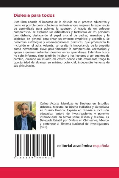 Este libro aborda el impacto de la dislexia en el proceso educativo y cómo es posible crear soluciones inclusivas que mejoren la experiencia de aprendizaje para quienes la padecen. A través de un enfoque comprensivo, se exploran las dificultades y fortalezas de las personas con dislexia, destacando el papel crucial de padres, maestros y la sociedad en general para crear un entorno empático y accesible. Se presentan estrategias y recomendaciones prácticas, que promueven la inclusión en el aula. Además, se resalta la importancia de la empatía como herramienta clave para fomentar la comprensión, aceptación y apoyo a quienes enfrentan desafíos en su aprendizaje. Este libro busca no solo informar, sino también inspirar a los lectores a ser agentes de cambio, creando un mundo educativo donde cada estudiante tenga la oportunidad de alcanzar su máximo potencial, independientemente de sus dificultades.