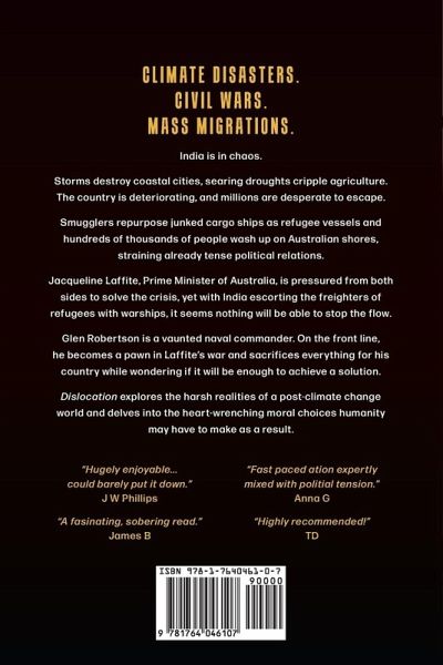 CLIMATE DISASTERS.CIVIL WARS.MASS MIGRATIONS. India is in chaos. Storms destroy coastal cities, searing droughts cripple agriculture. The country is deteriorating, and millions are desperate to escape. Smugglers repurpose junked cargo ships as refugee vessels and hundreds of thousands of people wash up on Australian shores, straining already tense political relations. Jacqueline Laffite, Prime Minister of Australia, is pressured from both sides to solve the crisis, yet with India escorting the freighters of refugees with warships, it seems nothing will be able to stop the flow. Glen Robertson is a vaunted naval commander. On the front line, he becomes a pawn in Laffite's war and sacrifices everything for his country while wondering if it will be enough to achieve a solution. Dislocation explores the harsh realities of a post-climate change world and delves into the heart-wrenching moral choices humanity may have to make as a result.