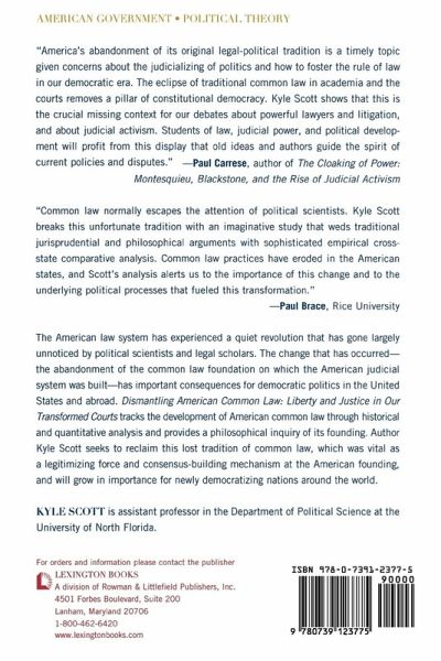 America's abandonment of its original legal-political tradition is a timely topic, given concerns about the judicializing of politics and how to foster the rule of law in our democratic era. The eclipse of the traditional common law in academia and the courts removes a pillar of constitutional democracy. Kyle Scott shows that this is the crucial missing context for our debates about powerful lawyers and litigation, and about judicial activism. Students of law, judicial power, and political development will profit from this display that old ideas and authors guide the spirit of current policies and disputes. -- Paul Carrese, author of The Cloaking of Power: Montesquieu, Blackstone, and the Rise of Judicial Activism This fine scholarly book contains ample, carefully compiled footnotes and an excellent bibliography...Recommended. CHOICE This perspective offers a new lens to ask questions about democracy, authority, and stability...Scott can add to this pursuit an appreciation for quantitative methods, which is well regarded in social science history. By asking theoretical questions and testing for variables drawn from that inquiry, Scott is encouraging an expansion of methods in studies of legal development. -- Kathleen Sullivan, Ohio University Common law normally escapes the attention of political scientists. Kyle Scott breaks this unfortunate tradition with an imaginative study that weds traditional jurisprudential and philosophical arguments with sophisticated empirical cross-state comparative analysis. Common law practices have eroded in the American states and Scott's analysis alerts us to the importance of this change and to the underlying political processes that fueled this transformation. -- Paul Brace, Rice University